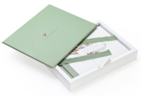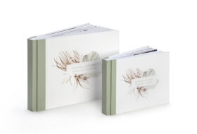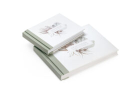 Το κυρίαρχο υλικό της σειράς είναι ξύλο βαμμένο σε λάκα λευκή με σατινέ υφή κι εκτύπωση UV στο οπισθόφυλλο . Εκτύπωση εικαστικού και τίτλων στο εξώφυλλο με ανεξίτηλα μελάνια και στο οπισθόφυλλο του βιβλίου του λογότυπού σας. Μία επιλογή 6 διαφορετικών σχεδίων για λευκώματα γάμου αλλά και βάπτισης για όσους εμπνέονται από την αρμονία της φύσης.