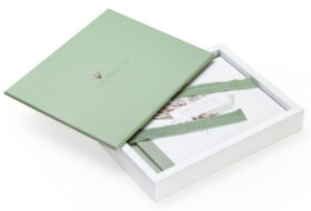 Κουτί του άλμπουμ. Μπορείτε να επιλέξετε ανάμεσα στα Premium Wood κουτιά με καπάκι από ξύλο και εκτύπωση UV ή καπάκι plexi-glass. Το ξύλινο καπάκι βγαίνει σε 2 χρώματα opac menta και opac ice.