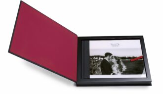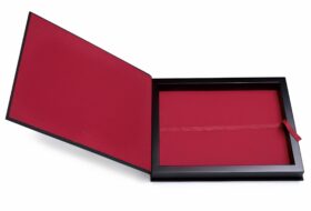 Το συνοδευτικό κουτί του άλμπουμ επενδύεται με την ίδια δερματίνη της ράχης και εσωτερικά με κόκκινη δερματίνη με την ίδια υφή. Στο εσωτερικό του τυπώνεται με βαθυτυπία το λογότυπό σας.