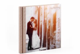 The cover is largely covered by a photo printed in metal. The back of the cover is made of leatherette or cloth. The metal print is colored but the metal base can be white, silver, gold or bronze, leaving a distinct sense in printing the photo. The combination of the colors of the selected photo with the metal base can give very nice results.