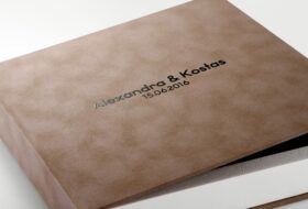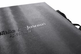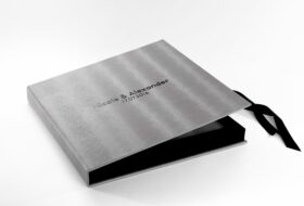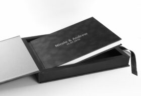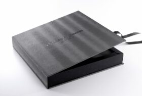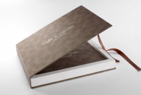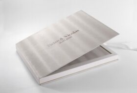 These boxes are lined with fabric and embedded case inside them in beige or black color. A ribbon inside the box at the bottom is included to easily lift the album. You can also print names on the outside of the box and your logo inside the part.