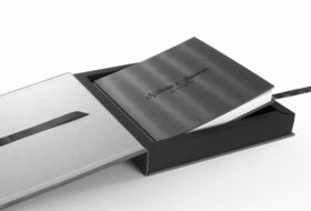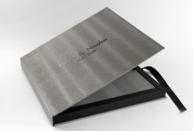 These are textile boxes that open in the center like shutters. They include an inner case in black or beige and also a ribbon at the bottom of the box for easy album picking. In this order the names and logos are printed inside the box, on the left and right sides of the box.