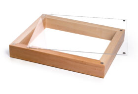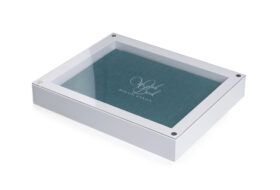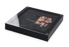 Luxurious wooden boxes painted with matte lacquer and plexiglass lid with 4 magnets to securely close. Their special design leaves the cover of the album visible, highlighting your choice and composing a complete product offering to your customers. Available in three colors: black, white and natural color.