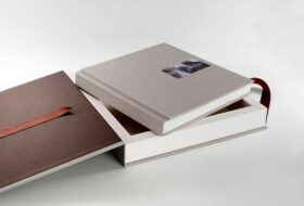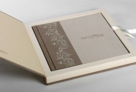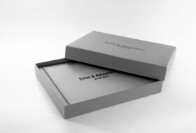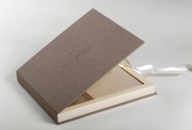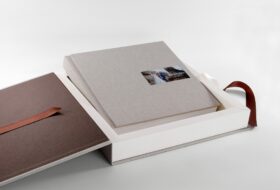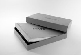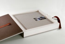 Εάν έχετε επιλέξει εξώφυλλο με δερματίνη για το ψηφιακό σας άλμπουμ, τότε προτείνουμε για την τελική του παρουσίαση, παράδοση σε ένα κουτί επενδυμένο επίσης από δερματίνη. Το κουτί περιλαμβάνει ενσωματωμένη θήκη σε εκρού ή μαύρο χρώμα και κορδέλα στο κάτω μέρος του για εύκολη ανασήκωση από τη βάση του κουτιού. Μπορείτε να εκτυπώσετε ονόματα και λογότυπα στην έξω πλευρά του κουτιού αλλά και στην εσωτερική του πλευρά.