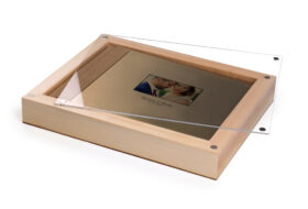 Με ενσωματωμένη ξύλινη θήκη βαμμένη λάκα στο εσωτερικό τους σε λευκό ή μαύρο χρώμα. Περιλαμβάνεται κορδέλα εσωτερικά του κουτιού στο κάτω μέρος, για να ανασηκώνεται εύκολα το άλμπουμ. Και σε αυτή την περίπτωση, μπορείτε να εκτυπώσετε ονόματα στην έξω πλευρά του κουτιού και το λογότυπό σας στο εσωτερικό του μέρος.